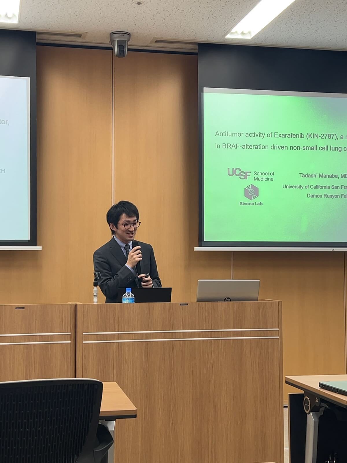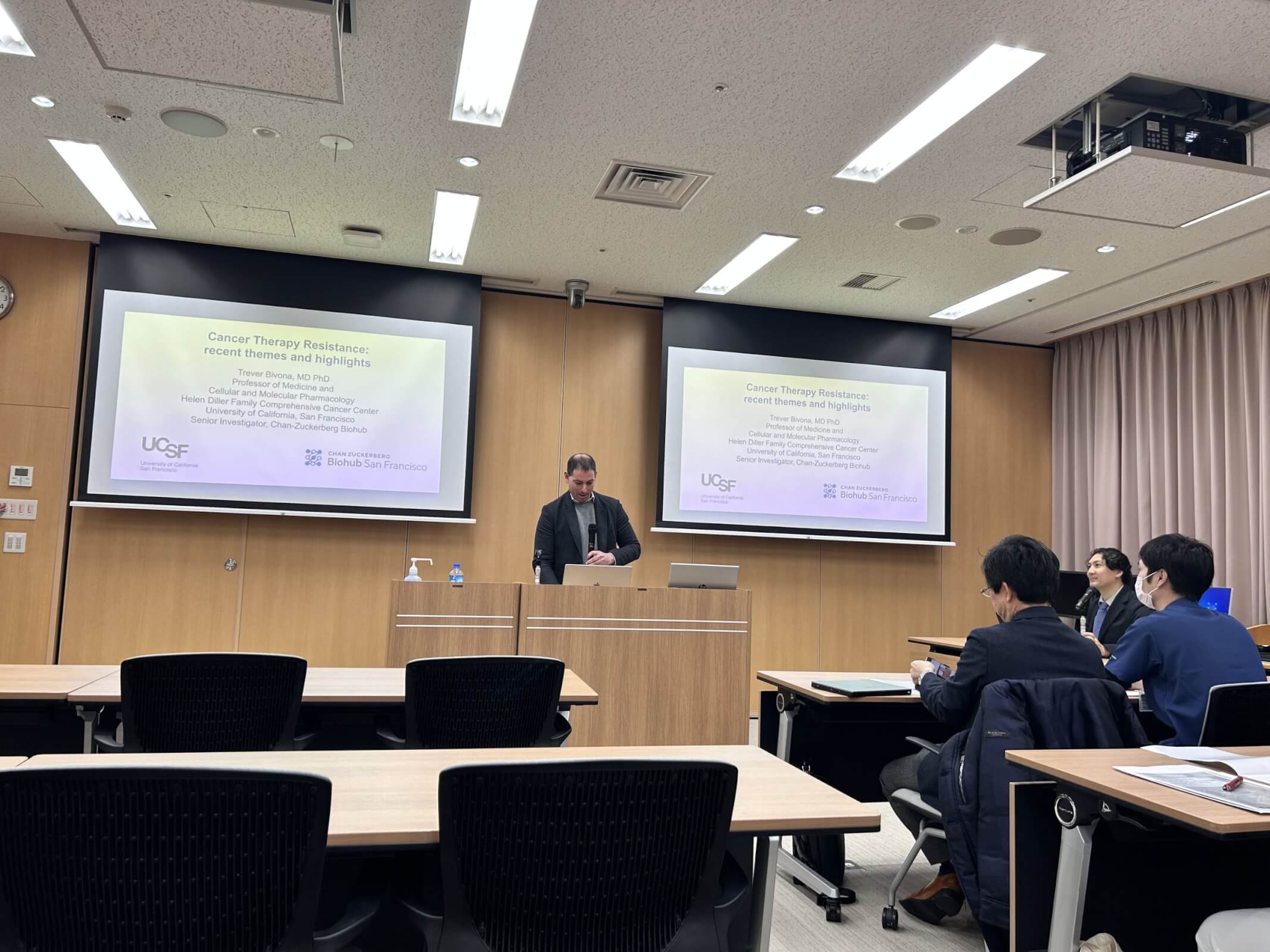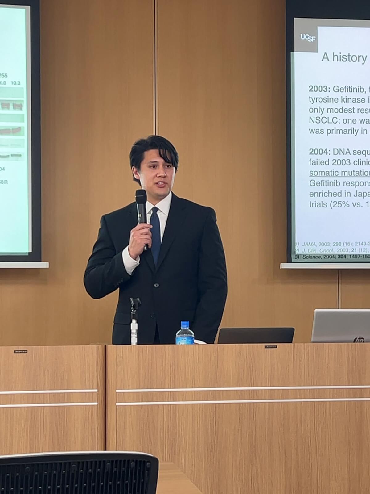 金沢大学CPDセンターにて国際シンポジウム「Overcoming drug resistance in lung cancer ~ From single cell to bedside」が行われました。主に癌耐性研究の大家であるUCSFよりTrever Bivona先生、Daniel Lucas Kerrs先生、Tadashi Manabe先生に来日いただき、EGFR遺伝子変異耐性機構に関する知見や、最新の研究手法を用いた研究プロジェクトについてご講演いただきました。講演会は大盛況で、その後の懇親会も日本の料理を楽しんでいただけたようです。今後UCSFとの共同研究が加速することが期待されます!